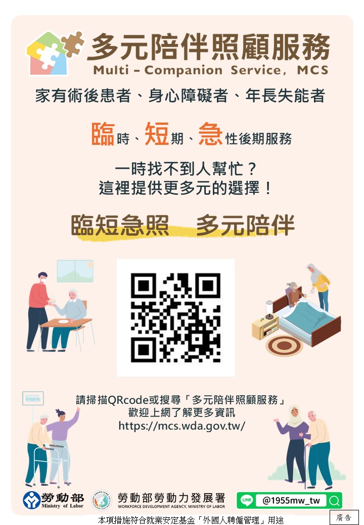 👉想瞭解更多,請上「多元陪伴照顧服務網站」https://mcs.wda.gov.tw/,或電洽1955免付費專線詢問。